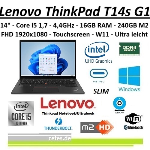 Lenovo Thinkpad T14s Gen1 Ultrabook 14″ Core i5 1,7Ghz, 16GB, 240GB NVMe, HD, USB C, WLAN, Win11